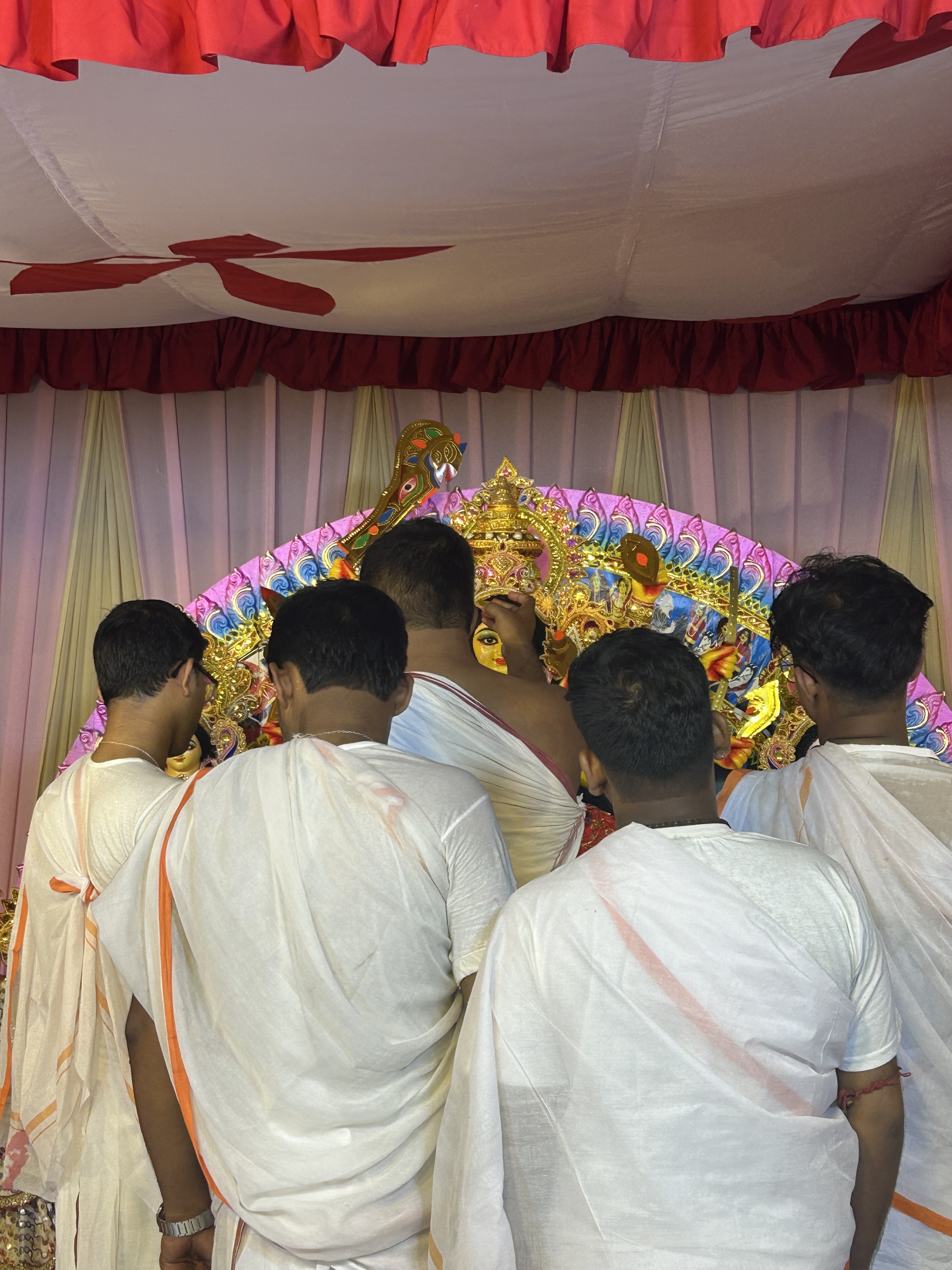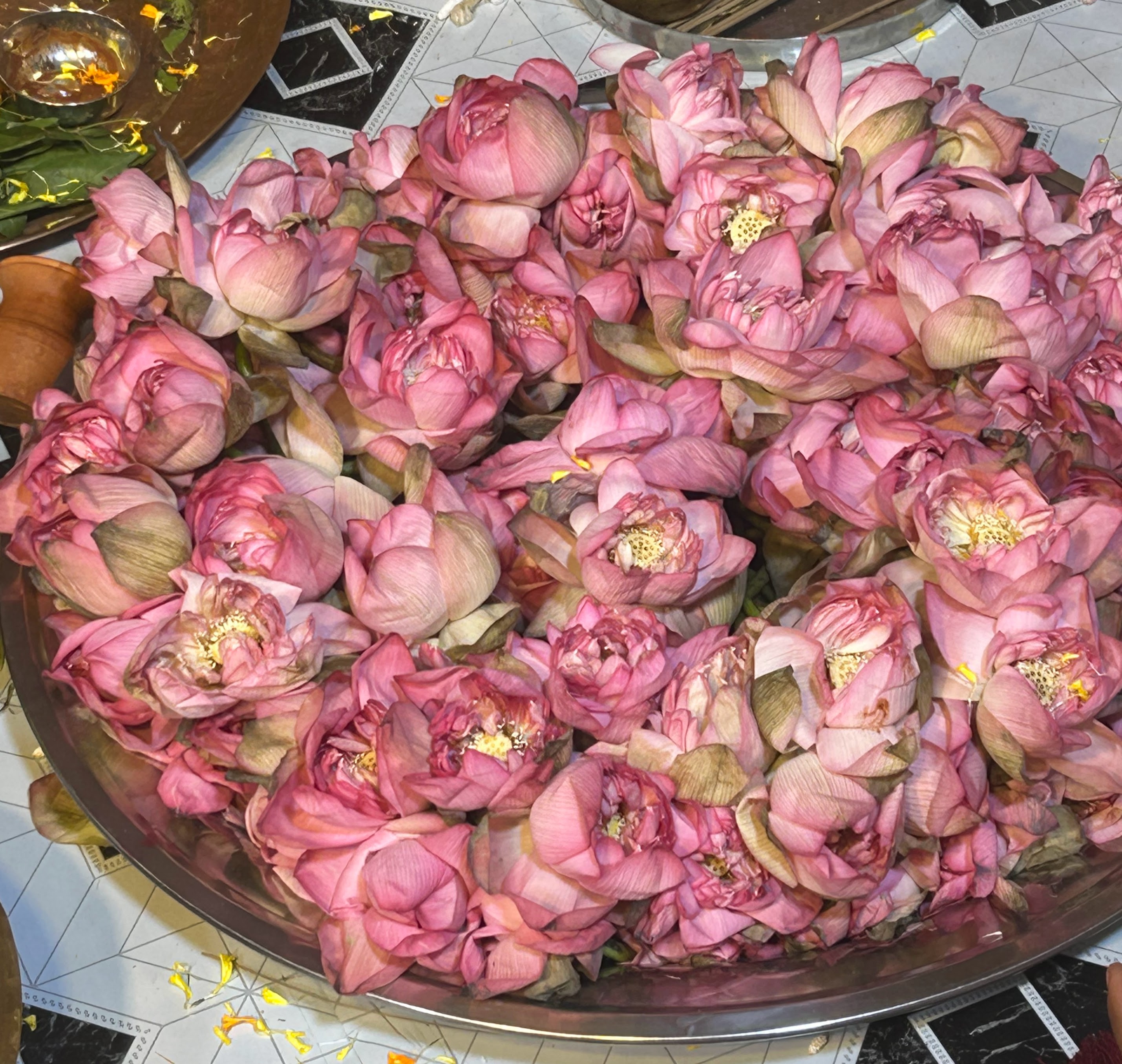 But it is the Sandhi Puja that transforms the day. That threshold moment when Ashtami gives way to Navami, when the sacred is marked with 108 lotuses and 108 diyas. This year, nature seemed to conspire with the ritual. Just as we prepared, a thunderstorm rolled in—lightning tearing across the sky, thunder echoing like a drum, and rain draping the world in cool relief.