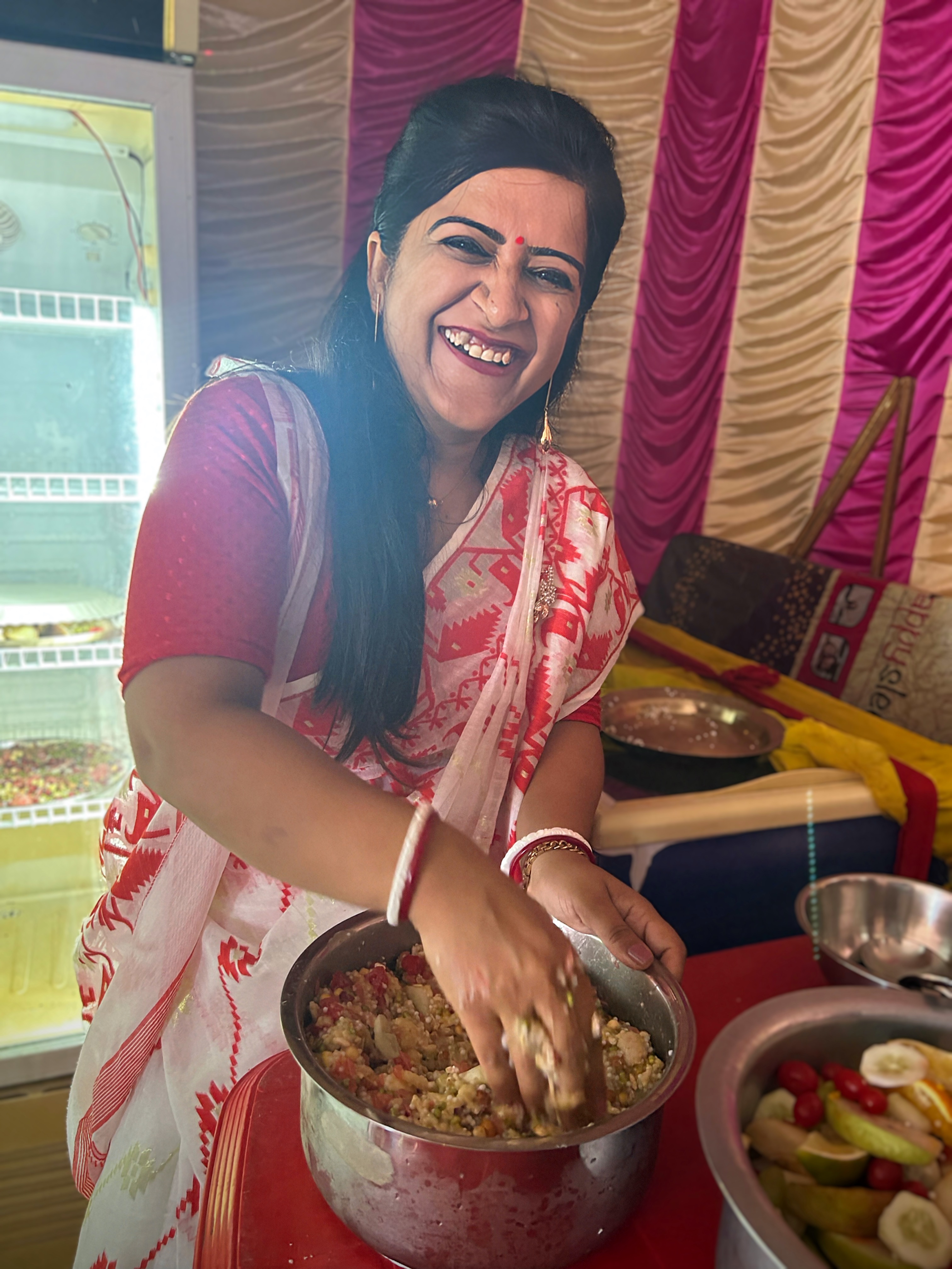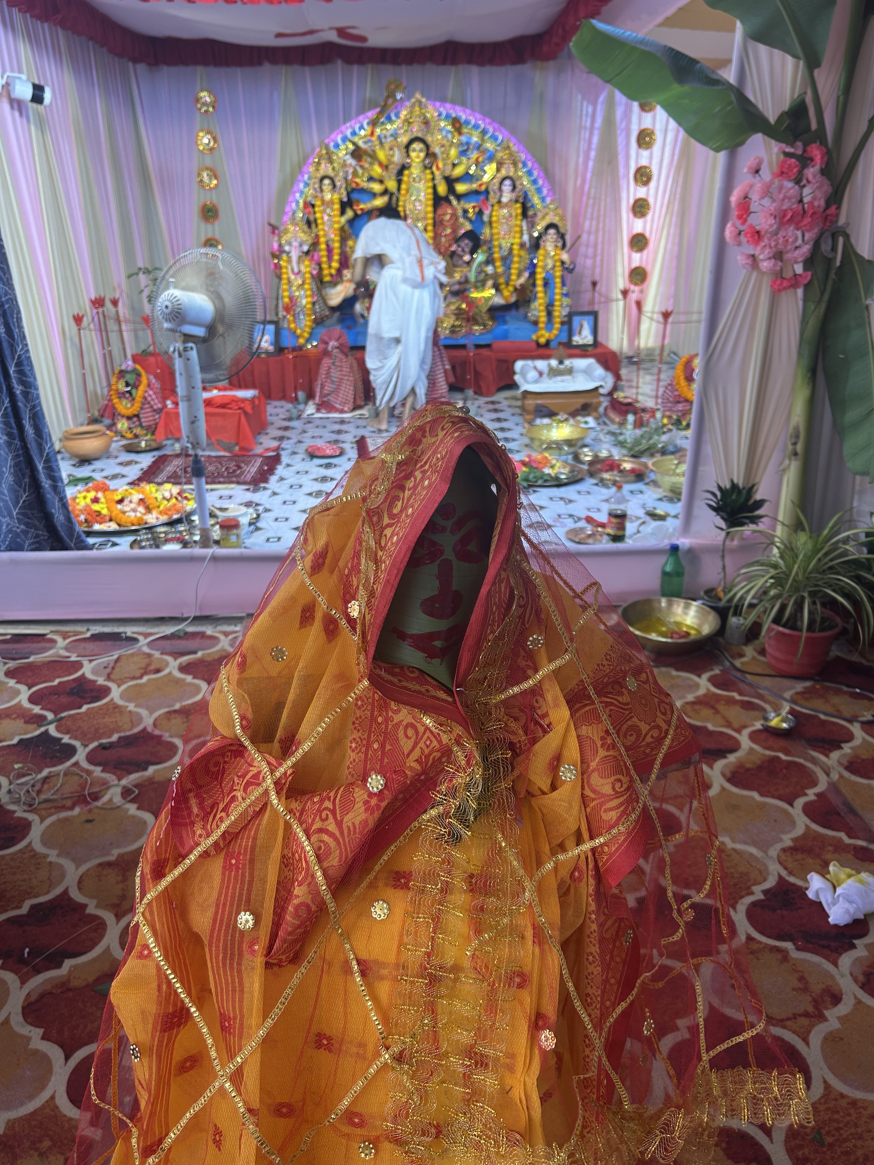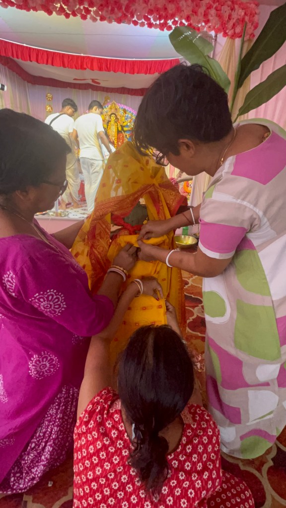 This morning, I found myself again in the role of the family’s saree-draper. It’s become an unspoken responsibility: draping pleats for cousins and younger members before the puja begins. Oddly enough, it fills me with joy. There’s a kind of generational continuity in the act—like passing down a secret language without words.