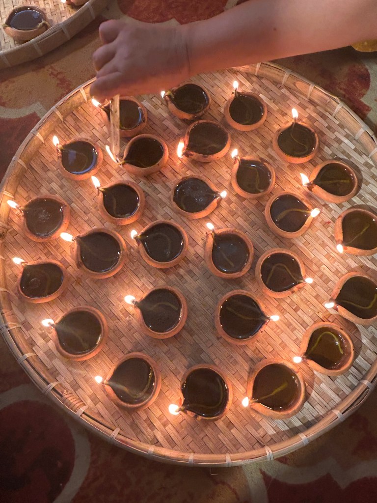 Then, in fresh clothes (yes, yet another round of changing), the family gathered again. One by one, the diyas were lit. There is something indescribably moving about watching flames multiply in the dark, each light a small prayer, a small connection, and doing it together as a family turns it into something eternal.