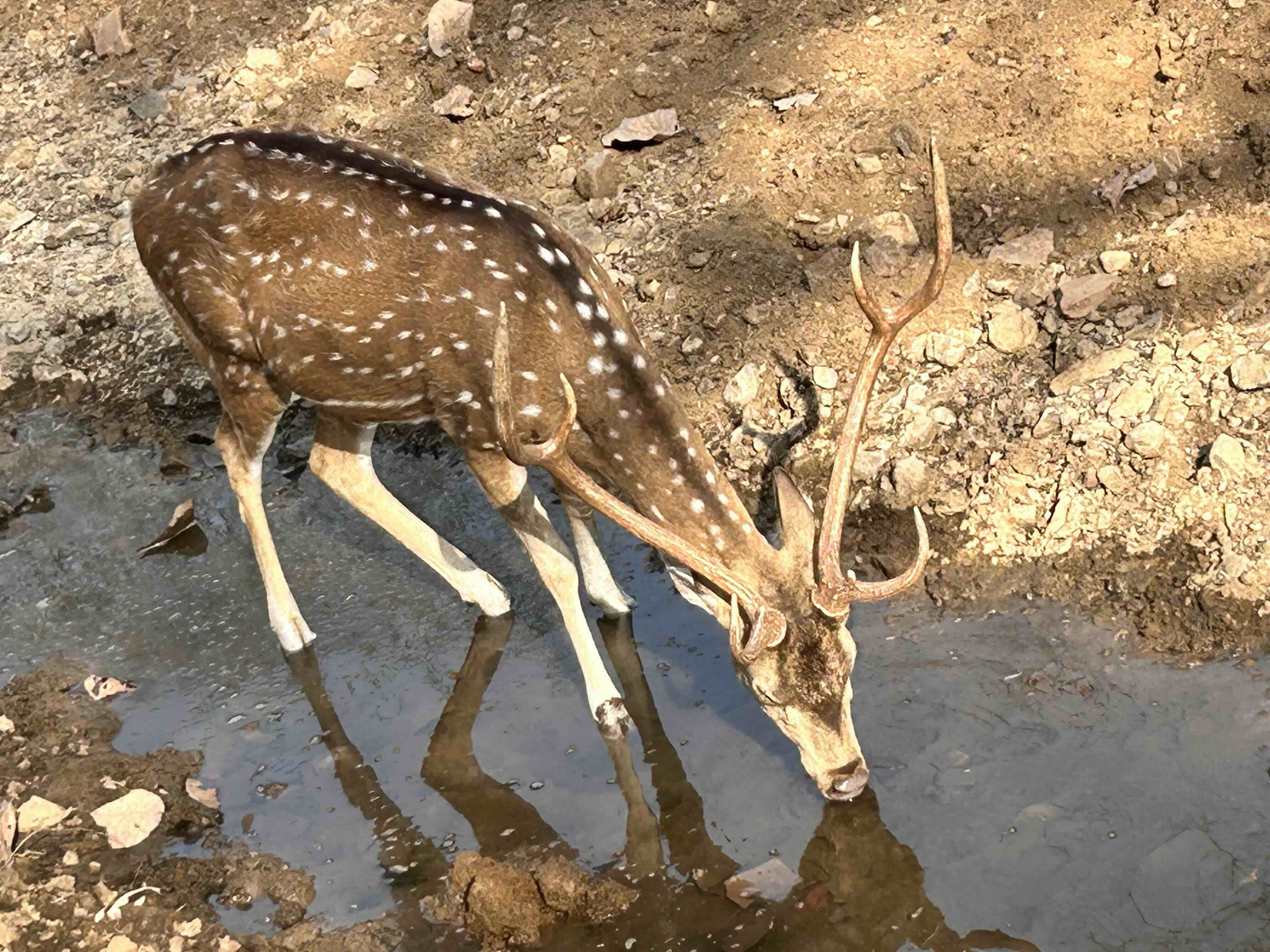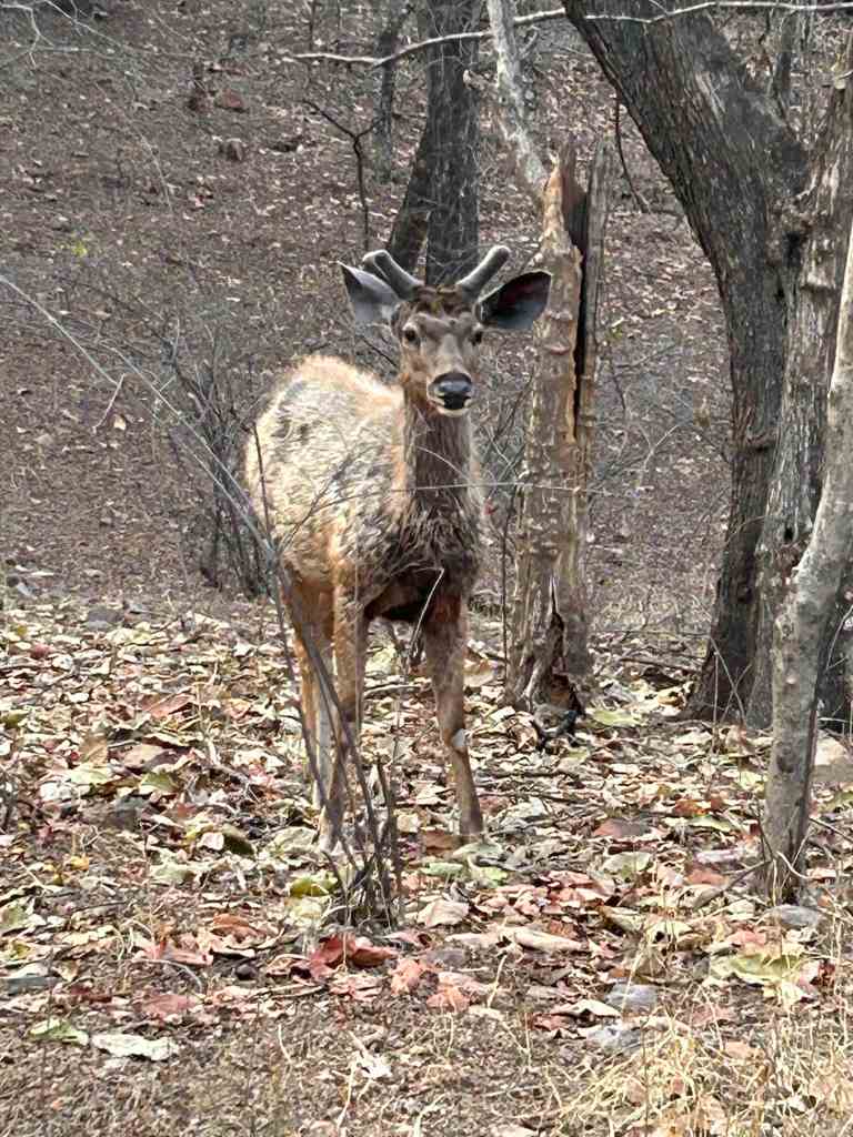 As we moved through the dry terrain, we noticed a sambar suddenly turn alert. Moments later, the unmistakable alarm call echoed through the trees. We stopped under the shade of a mango tree, waiting, listening, hopeful. But the call faded, and the forest returned to its stillness.