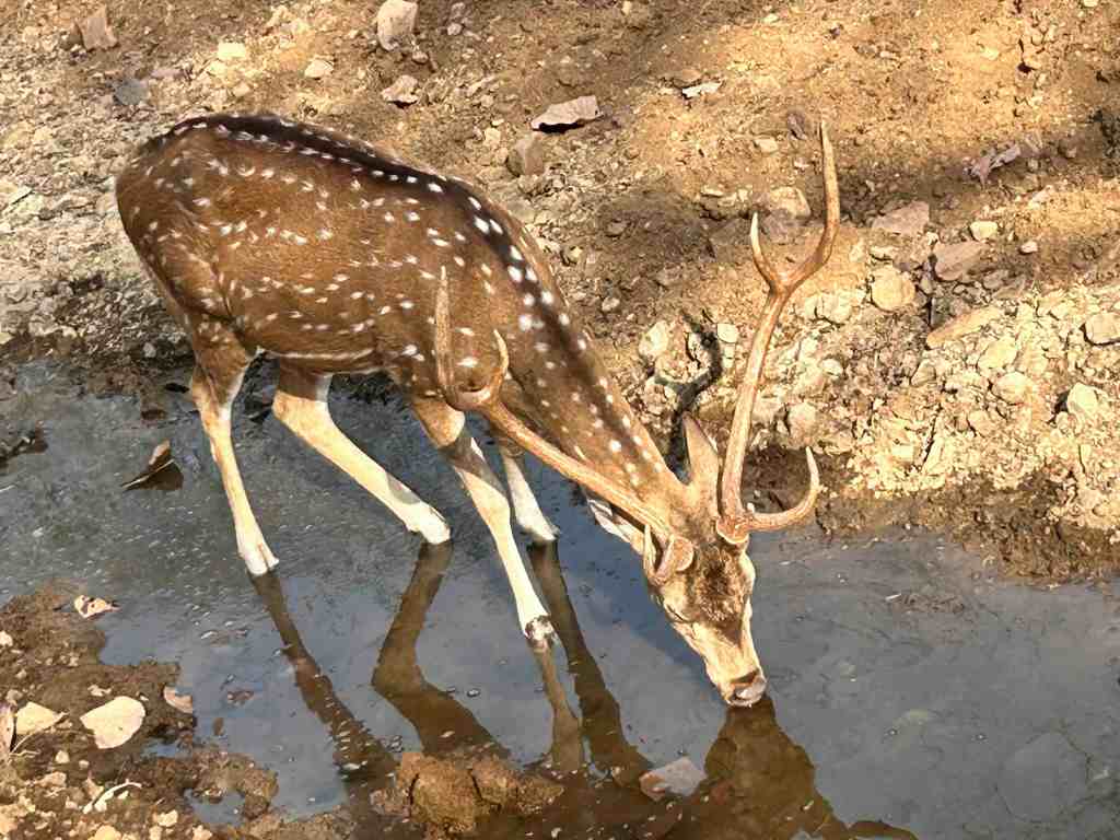 I told my guide that while I would like to see a tiger, I was equally keen to experience the jungle in its entirety. And so we moved, past spotted deer grazing cautiously, sambar standing alert, langurs observing from treetops, and peacocks adding fleeting bursts of colour. Yet, inevitably, the search for the tiger shaped our path. We paused at waterholes, scanned trails, and at one point even came across fresh pugmarks. The signs were there, but the tiger chose to remain unseen.