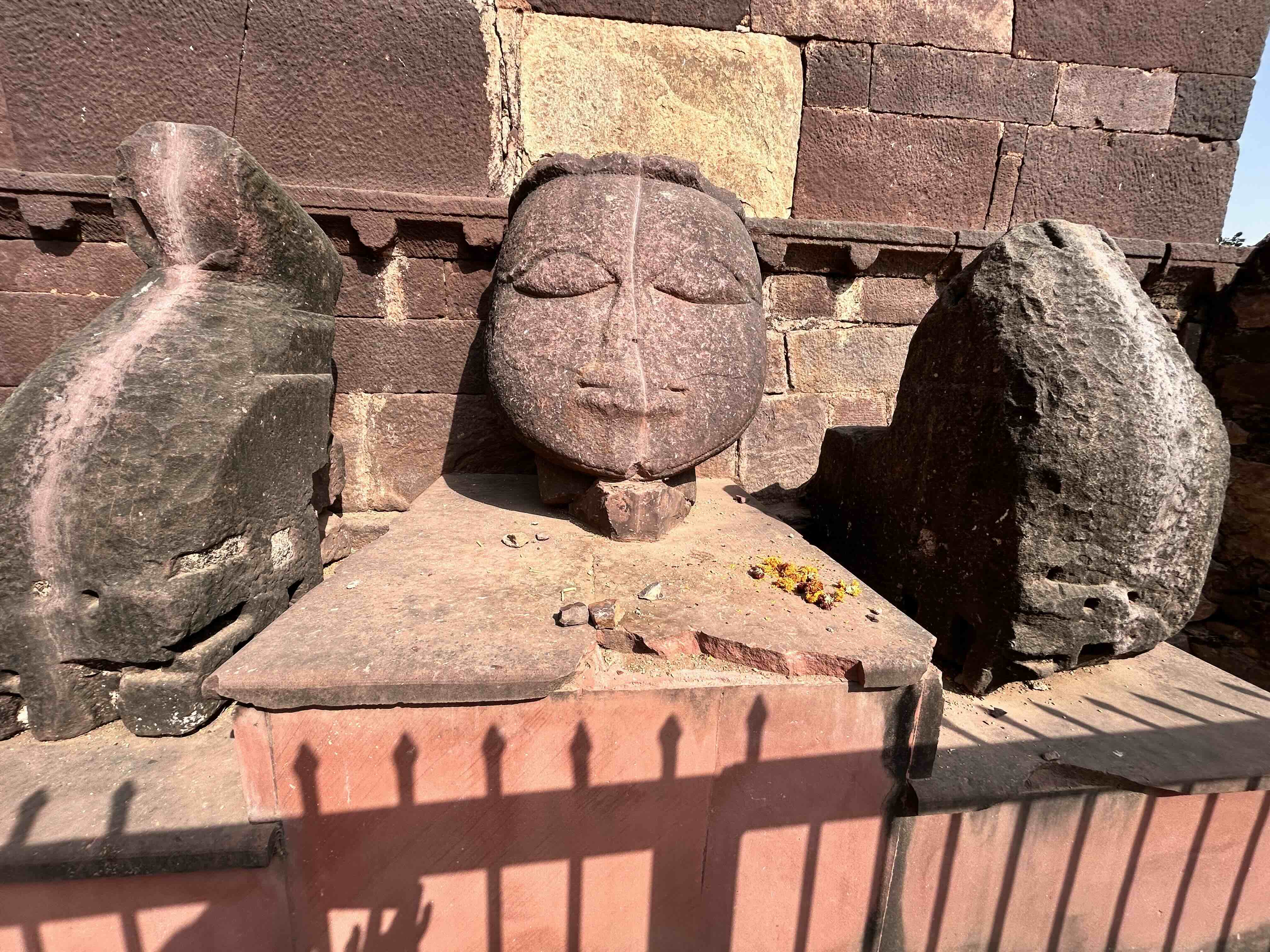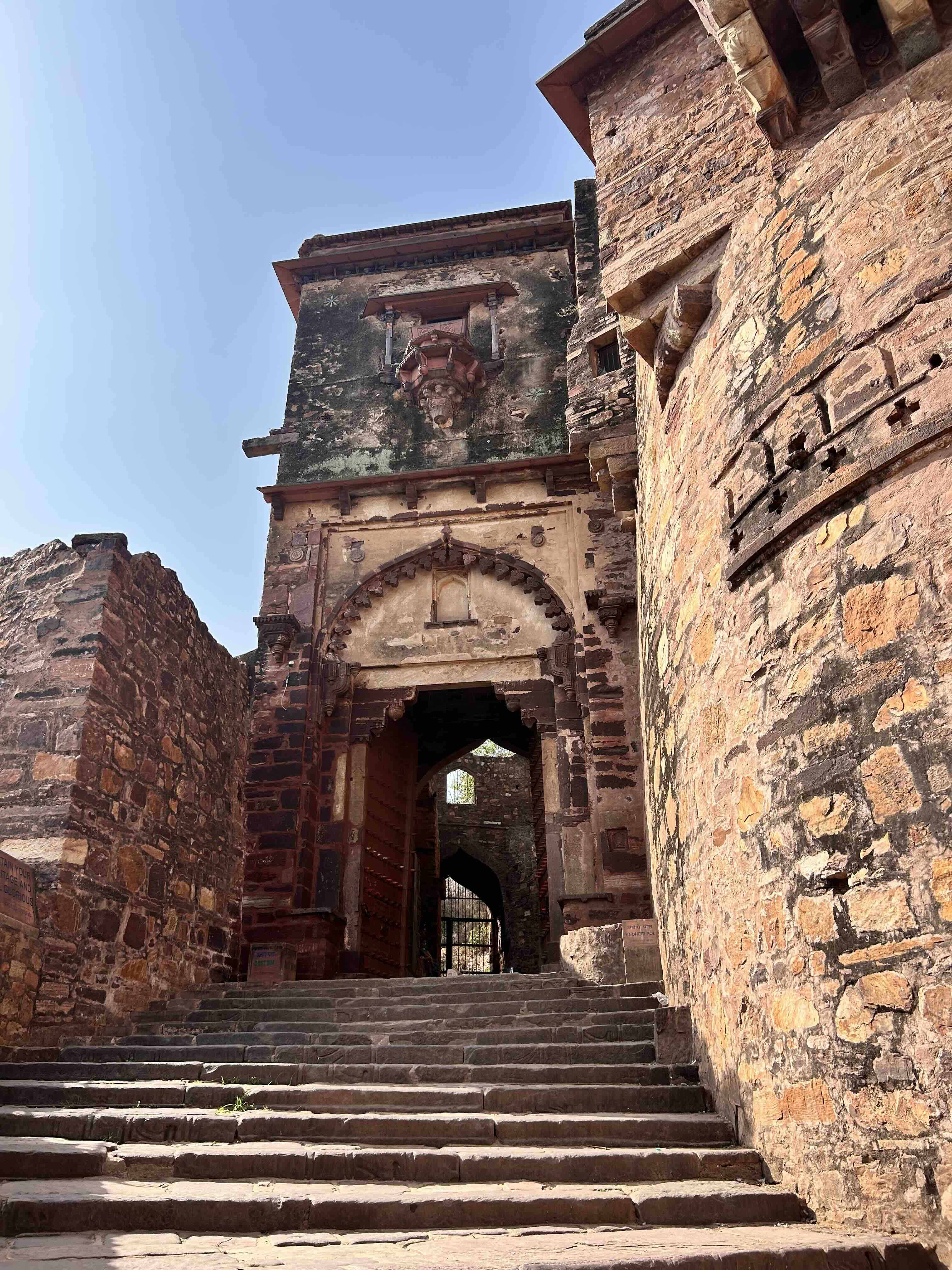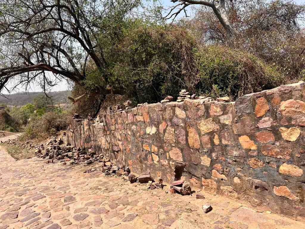 We began our ascent through Navlakha Pol towards Hathi Pol. There, I noticed a peculiar stone carving, a face, a torso, a hand. It represents Ranmal, a general who is believed to have betrayed King Hammir Dev Chauhan to Alauddin Khilji in 1301. Locals still throw stones at the carving, a symbolic act of contempt for betrayal.