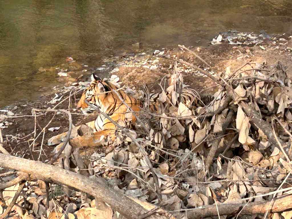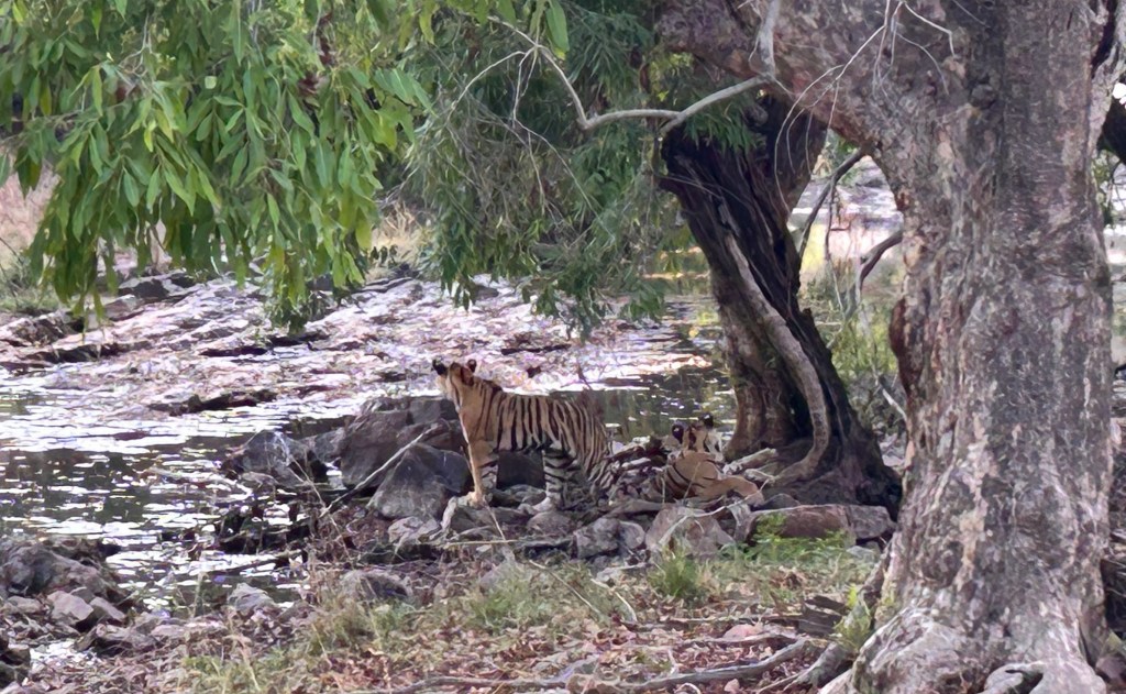 Two cubs lay quietly near the water. Cameras clicked in unison. One cub rose, took a few tentative steps, and settled under another tree. Almost immediately, a sambar’s alarm call rang out, sharp, insistent, continuing until the cub disappeared into stillness once more.