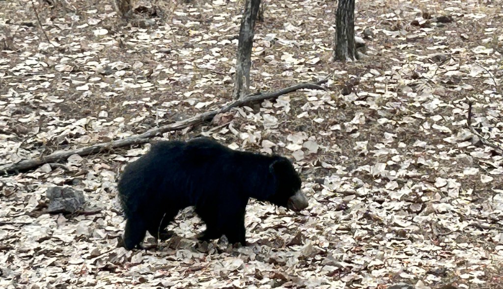 As the safari neared its end, we began heading back. Not far from the exit, a small crowd of vehicles had gathered. A sloth bear ambled across the track, indifferent to the attention, offering one final, unexpected sighting.